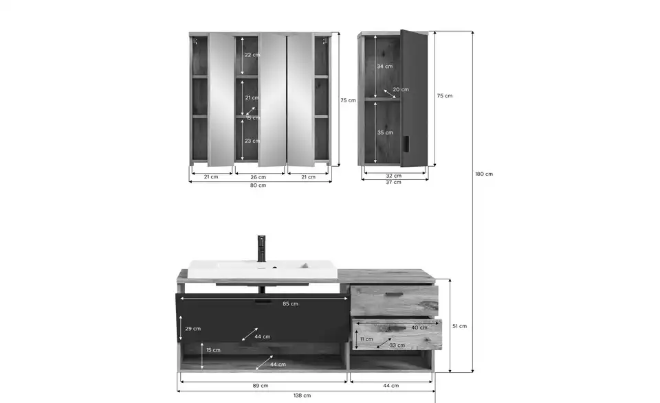 1x Waschtisch (B/H/T ca. in cm138/51/48 cm), 1x Spiegelschrank (B/H/T ca. in cm: 80/75/20 cm); 1x Hängeschrank (B/H/T: 37/75/25 cm)