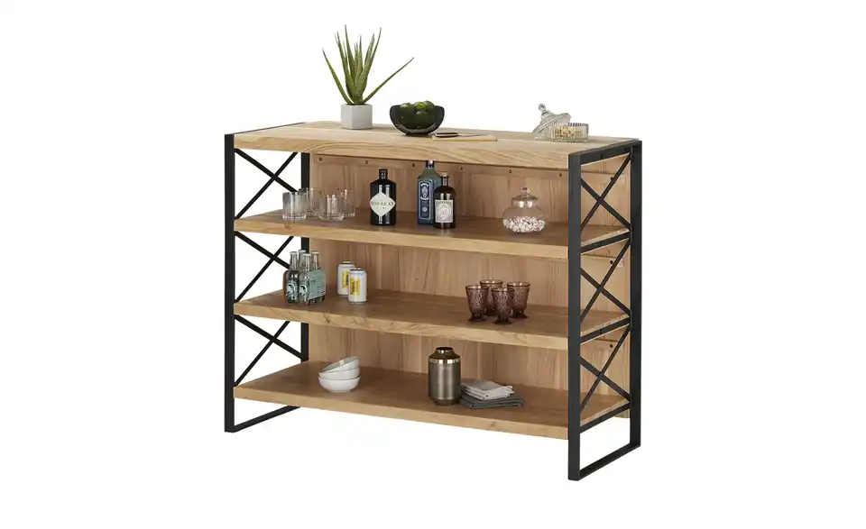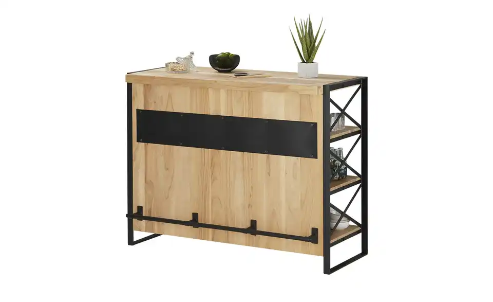 Eine Bar im Wohnzimmer ist schon etwas ganz besonderes. Und wenn sie dann auch noch im Industrial-Look daherkommt, dann sind Ihnen neidische Blicke garantiert. Wie zum Beispiel mit der Bar Queens und ihrem Materialmix. Die Holzflächen bestehen aus massiver Akazie. Sie ist stabil, langlebig und verfügt über eine rustikale Maserung mit Farbunterschieden und Asteinschlüssen. Das Holz ist gebeizt und lackiert. Hinzu kommen Seiten und Akzente aus schwarzem Metall. Sie setzen sich vom hellen Holz ab und zaubern den besonderen Industrie-Charme. Queens verfügt über drei große offene Fächer. Die Abdeckplatte dient als Tresen.
