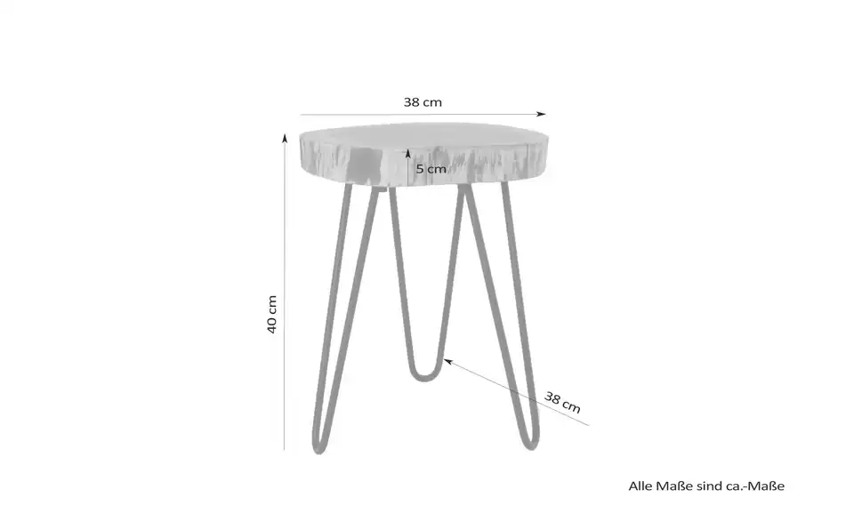 Dieser Beistelltisch überzeugt mit seiner Tischplatte mit attraktiver Baumschnitt-Optik. Das massive Akazienholz wird mit einer matten Lackierung geschützt, sodass die Optik erhalten und die Tischplatte geschützt wird. Getragen wird die Tischplatte durch ein filigranes Haarnadel-Gestell aus schwarzem Metall. Der Tisch lässt sich problemlos zu zahlreichen Einrichtungsstilen kombinieren und passt in diverse Raumkonzepte.