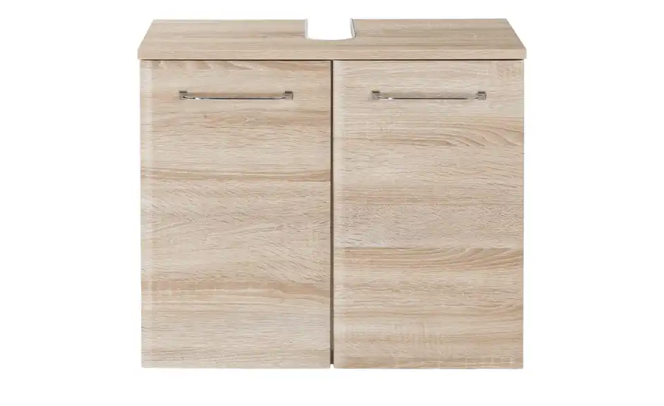 Wie der Name schon erahnen lässt, wird der Waschbeckenunterschrank Juba direkt unterhalb des Waschbeckens angebracht. Die Oberplatte ist mit einer Aussparung versehen, damit das Abflussrohr im Schrank integriert werden kann. Hinter den beiden Türen bietet Juba viel Platz für Hygieneartikel und Putzmittel. Die Türen schließen Dank des integrierten Türdämpfers leise. Die chromfarbigen, glänzenden Griffe setzen sich vom Holzdekor in Eiche Natur (Nachbildung) ab.