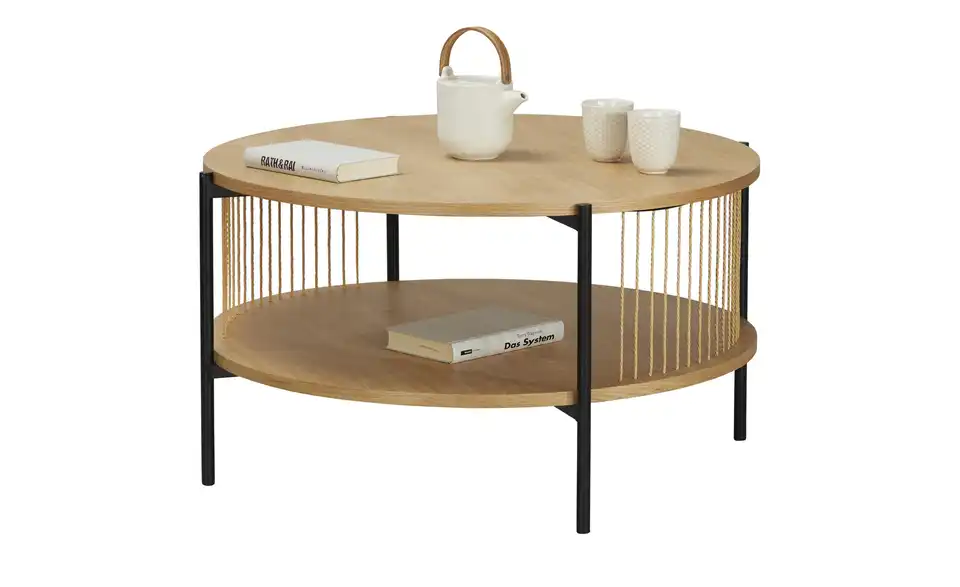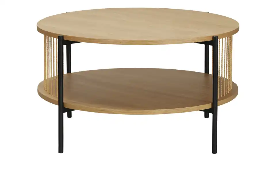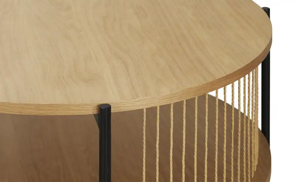 Dieser helle und freundliche Couchtisch verbindet natürliche Materialien wie Naturfaser und Eichenfurnier mit robustem, modernem Metall. Insgesamt 80 Zentimeter Fläche stehen Ihnen zur Verfügung: Gleich zwei Mal! Nutzen Sie die obere Tischplatte zum Beispiel für Kaffee und Kuchen und die untere Ablageplatte für Fernsehzubehör und Mehr.