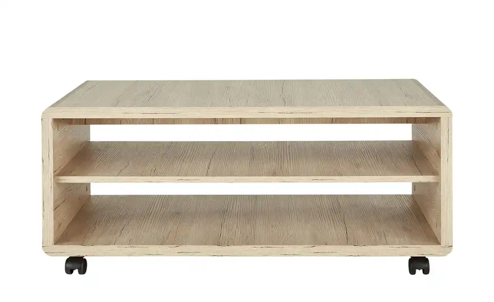 Der Couchtisch Turino ist ein praktisches Highlight. Neben einer großen rechteckigen Tischplatte bietet er zwei geräumige offene Fächer. Anstelle von Füßchen ist Turino mit vier Rollen ausgestattet. Sie machen den Couchtisch richtig mobil. Bewegen Sie ihn einfach dorthin, wo Sie ihn brauchen. Tischplatte, Gestell und Ablagen haben ein Dekor in Eiche San Remo (Nachbildung). Es sorgt für natürlichen Charme, der mit dem modernen Gesamtlook harmoniert.