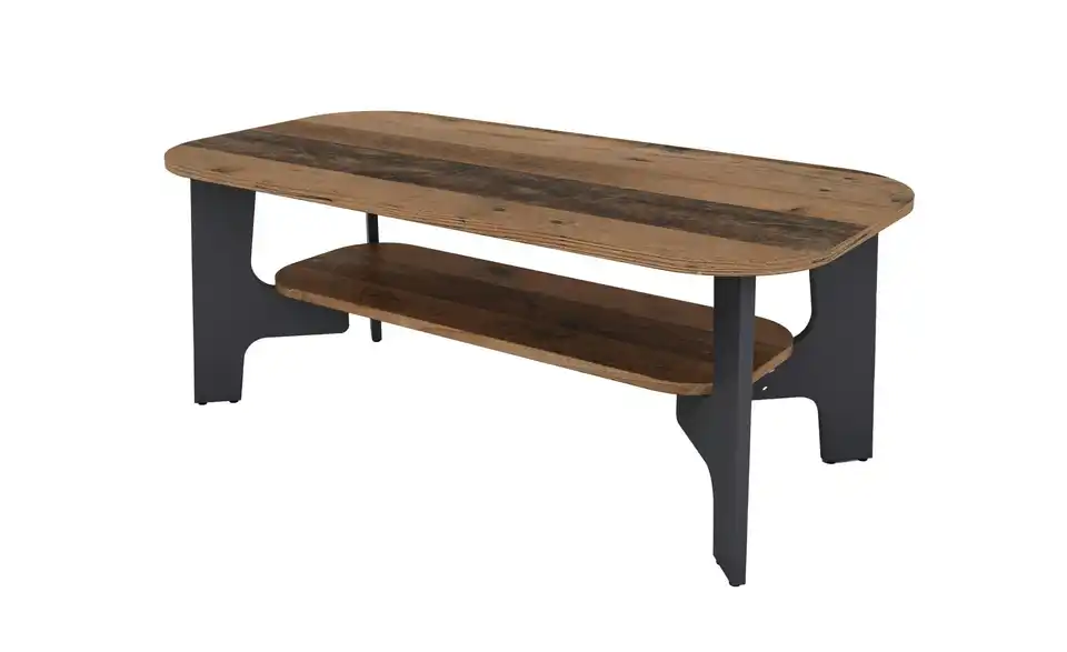 Dieser Couchtisch bietet dank seiner zwei Ablagemöglichkeiten extra viel Platz und Möglichkeiten. Genießen Sie einen Filmeabend mit Snacks und verstauen Sie lose Zeitschriften und Deko so lange auf der unteren Ablagefläche. Für Kaffee und Kuchen bietet die großzügige Tischplatte ebenfalls ausreichend Platz. Dank des rustikalen Designs und der attraktiven Nachbildung in Old Wood, bekommt der Couchtisch eine leichte Industrial-Note.