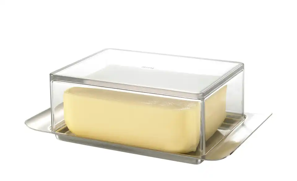 Diese Butterdose ist perfekt zugeschnitten für ein Stück Butter. Damit sie in jeder herkömmlichen Kühlschranktür ihren Platz findet, wurde der Untersetzer aus hochwertigem Edelstahl bewusst schlank gestaltet – aber mit großzügigen Griffen, die gut in der Hand liegen. Die Haube aus SAN-Kunststoff vermittelt eine verblüffende Glasoptik – unempfindlich, aber doch glasklar! Zudem ist die großzügige Haube so gestaltet, dass sie nicht mit der Butter in Berührung kommt – so ergibt sich die appetitliche Optik. Die schnörkellos schöne Butterdose ist natürlich spülmaschinengeeignet.
