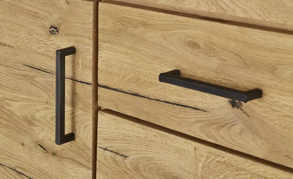 Stauraum für Wohnzimmer oder Essbereich, den bietet die Kommode Black Coast One von Gray & Jones. Links steht Ihnen eine Tür mit zwei Fächern dahinter zur Verfügung. Rechts hat die Kommode vier geräumige Schubladen. Dank der Soft-Close-Funktion schließen Tür und Schubladen langsam und leise. Black Coast ist mit Eichenholz furniert und zusätzlich lackiert worden. Für einen guten Stand ist der Sockel aus massiver Eiche gefertigt worden. Das Holz zeichnet sich durch seine Qualität und ausgeprägte Maserung aus.