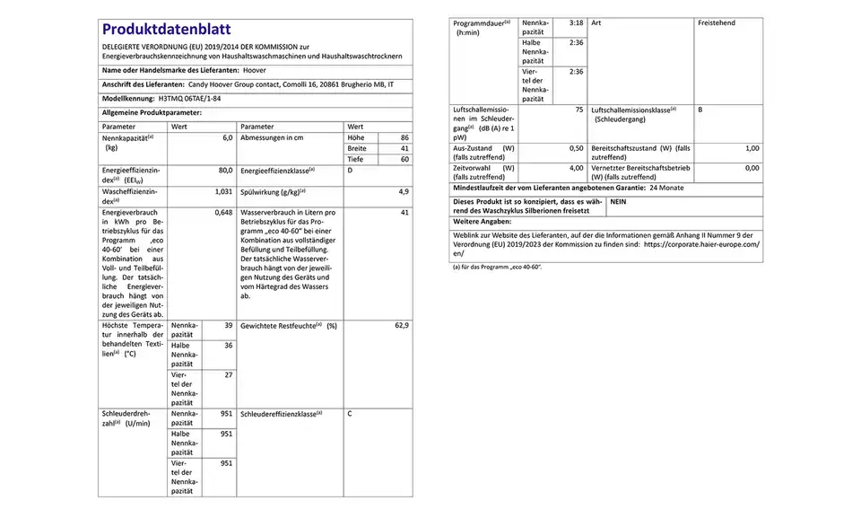 - Gewichteter Wasserverbrauch pro Zyklus 41 l
