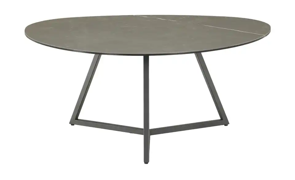 Dieser edle Designer-Couchtisch verbindet schwarzes, pulverbeschichtetes Metall mit einer organisch geformten Keramik-Tischplatte. Die ca. 90 x 75 Zentimeter große, graue Tischplatte bietet eine großzügige Ablagefläche und ist schön strukturiert. Die drei Tischbeine sind gekonnt miteinander verbunden und betonen das loftige, moderne Erscheinungsbild.