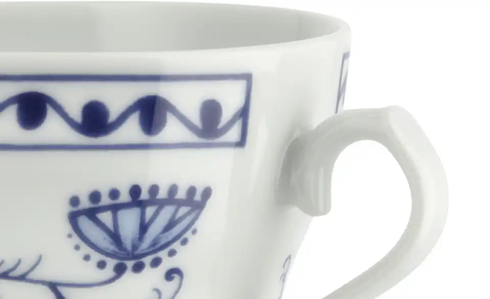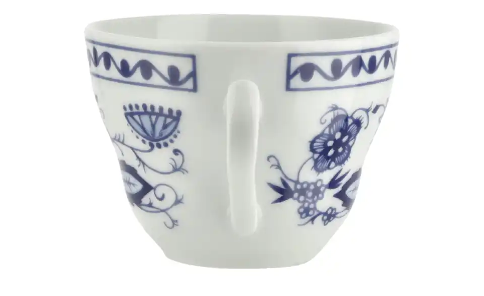 Das Frühstück, Mittag-, oder Abendessen, serviert auf dem Porzellan mit dem verspielten Zwiebelmuster, schmeckt gleich noch mal so gut. An kleinen Besonderheiten, der stilisierten Rosenknospe, dem bogenförmigen Rand und dem floral geschwungenen Henkel, kann sich das Auge stets erfreuen. Die intensive blaue Farbe weckt die Lebensgeister. Das Zwiebelmuster, festlich aufgelegt, verleiht der Tafel vornehmen Charakter. Da bleibt man gerne länger sitzen.