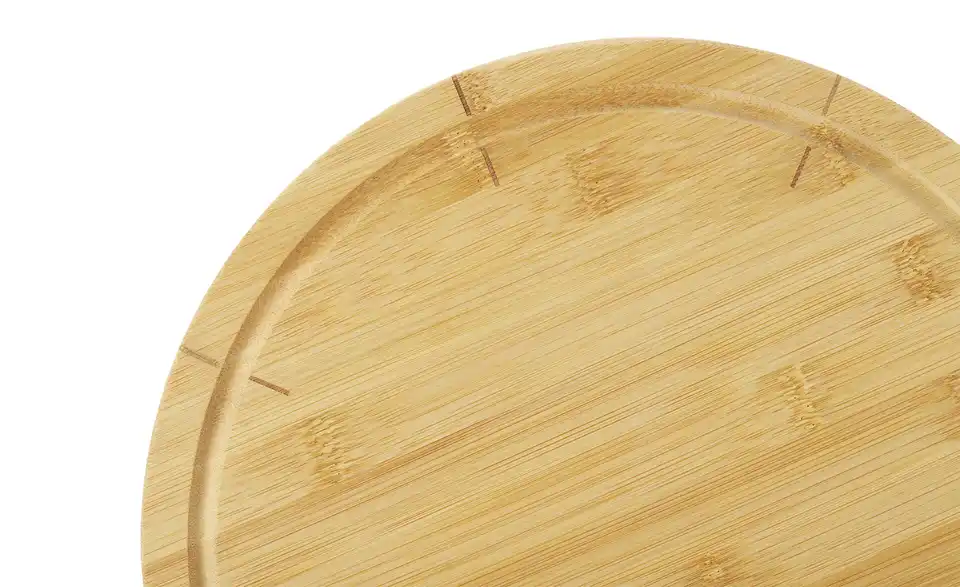 Pizzateller mit Markierungen zum Achteln der Pizza. Der Teller hat zwei Griffmulden zum einfachen Zugreifen und Anheben sowie eine Saftrille, damit Flüssigkeiten nicht ungehindert vom Teller fließen.