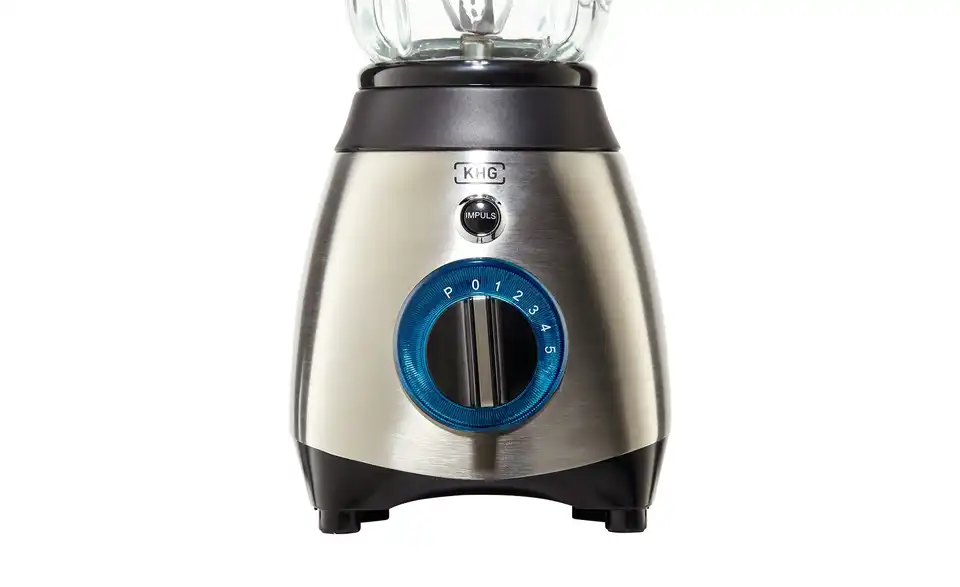 Mit dem Standmixer STA-600E der Marke KHG können Sie zum Beispiel Mixgetränke oder pürierte Speisen herstellen. Auch Cocktails und Saucen lassen sich mit ihm zubereiten. Die vierflügelige Messereinheit im Innern zerkleinert zum Beispiel Obst oder Gemüse. Der Zerkleinerungsgrad der eingefüllten Nahrung lässt sich in dem durchsichtigen Mixbehälter gut beurteilen. Der Deckel des Behältnisses verfügt über eine separate Einfüllöffnung. Die Geschwindigkeit ist in fünf Stufen regelbar. Der dafür verantwortliche Drehschalter am Fuß des Mixgeräts wird durch einen blauen Ring optisch hervorgehoben und fügt dem Design in Glas- und Edelstahloptik einen Farbakzent hinzu.