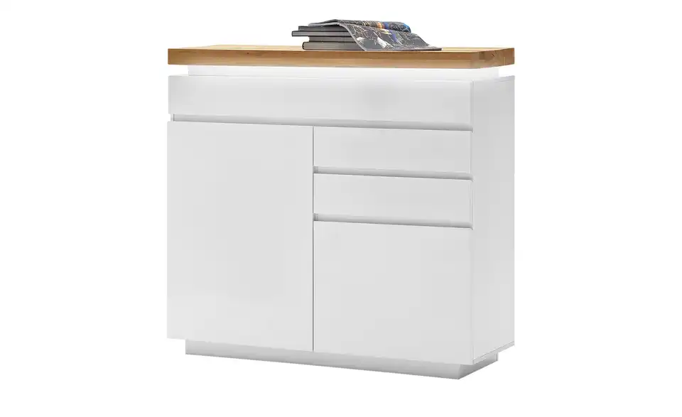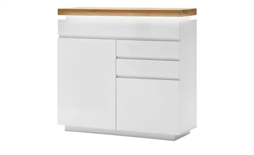 Die Kommode Fornico hat ein stylisches Design. Setzen Sie es mithilfe der LED-Beleuchtung in Szene. Sie befindet sich unterhalb der Abdeckplatte und lässt sich mit einer Fernbedienung regulieren und dimmen. Fornico ist komplett in mattem Weiß lackiert. Einzig die Abdeckplatte setzt sich in Eiche ab. sie besteht aus hochwertigem, geöltem Echtholz. Neben der Optik bietet Fornico auch Stauraum: Ihnen stehen eine große und zwei kleine Schubladen sowie zwei Türen mit viel Platz dahinter zur Verfügung.