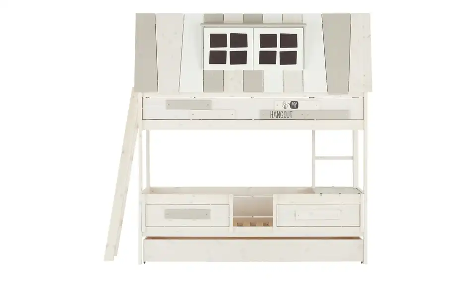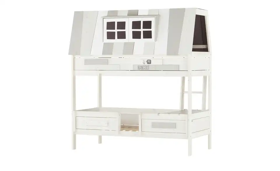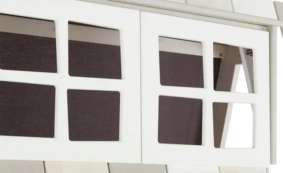 Basisbett inklusive Rollrost, Oberteil für Hangout, Absturzsicherung kurz, kleine Leiter mit 2 Stufen, Dachkonstruktion, Dachbretter mit Fenster und Stoff