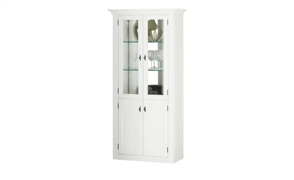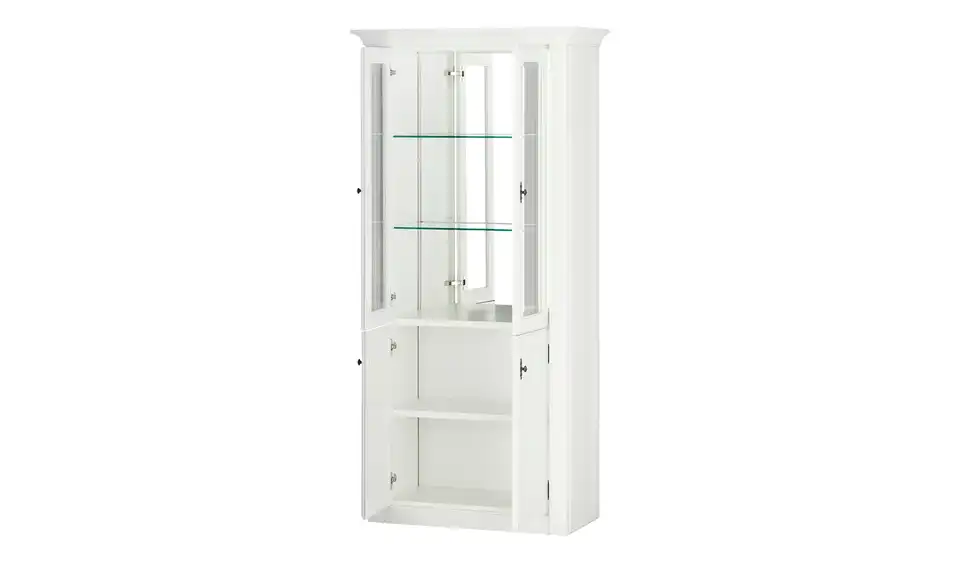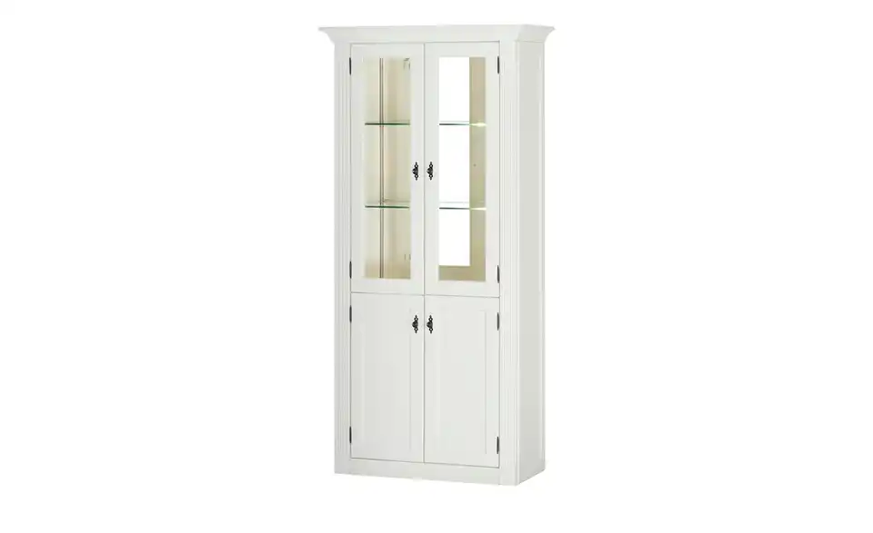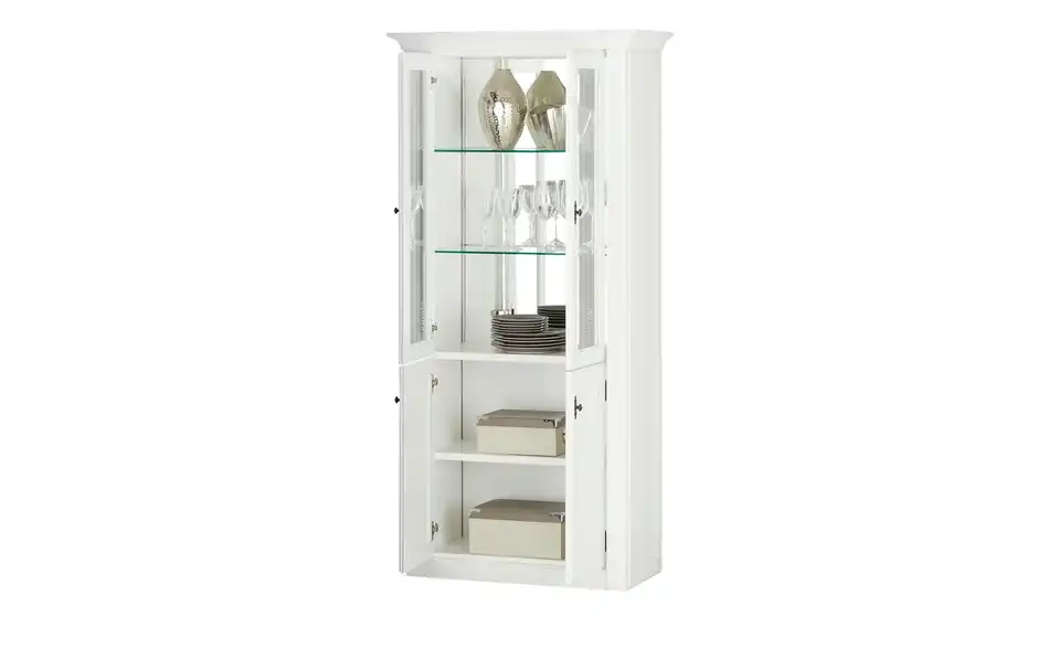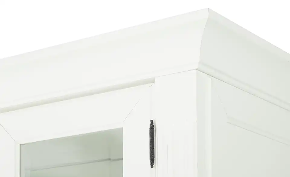 Die Vitrine der Serie Petit Chalet überzeugt mit liebevollen Details und ihrem charmanten Landhausstil. Die Zierstrukturen befinden sich am Kranz, den Fronten und in Form eines Facettenschliffs an den Glastüren. Nutzen Sie zwei blickdichte Fächer und drei einsehbare Fächer für Deko, Bücher und Mehr. Entscheiden Sie selbst, ob Sie Holzböden oder Glasböden hinter den beiden Vitrinentüren bevorzugen. Gut zu wissen: Dank zeitgemäßer Soft-Close-Funktion schließen die Türen besonders leise.