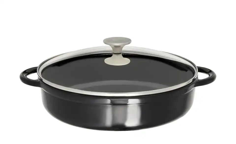 Diese Servierpfanne von Meisterkoch können Sie zum Zubereiten von Speisen und anschließendem Servieren nutzen. Die Pfanne selbst ist aus robustem Gusseisen. Die Oberfläche ist emailliert. Der Deckel ist aus Glas.