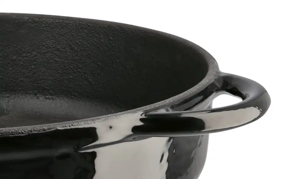 - Gusseisen verteilt die Wärme gleichmäßig bis zum Rand und speichert lange