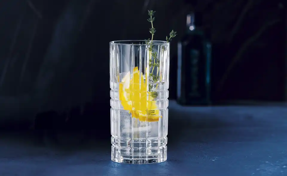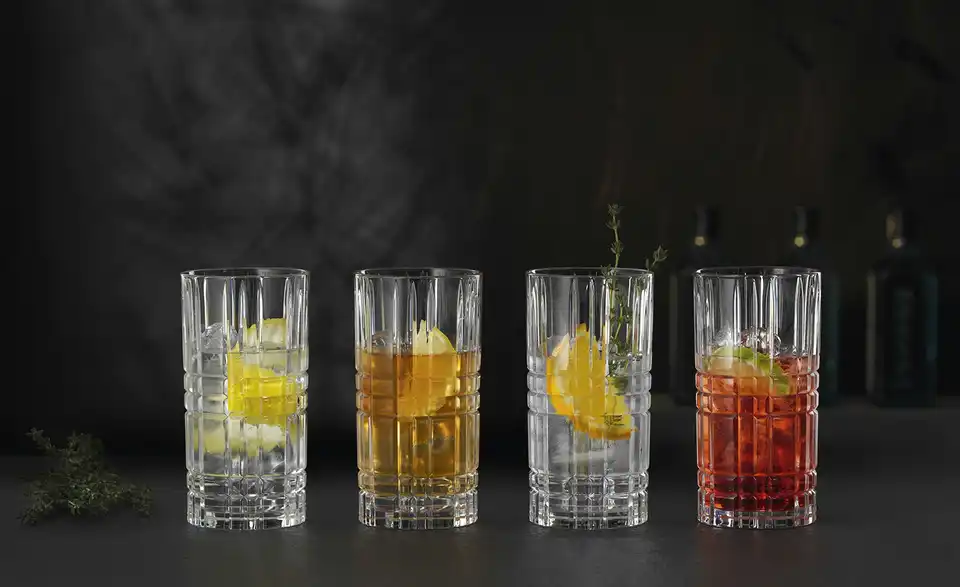 Die Becher, Schalen und Platten dieser Serie haben ein puristisches und modernes geometrisches Design mit Schliffdekor, das die Brillanz im klaren Kristallglas besonders hervorhebt.