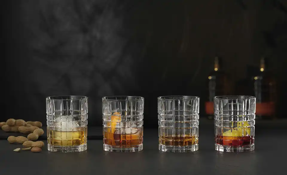 Die Becher, Schalen und Platten dieser Serie haben ein puristisches und modernes geometrisches Design mit Schliffdekor, das die Brillanz im klaren Kristallglas besonders hervorhebt.