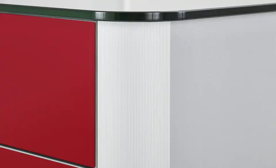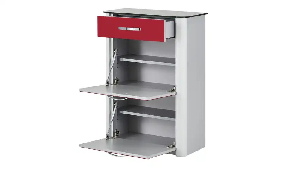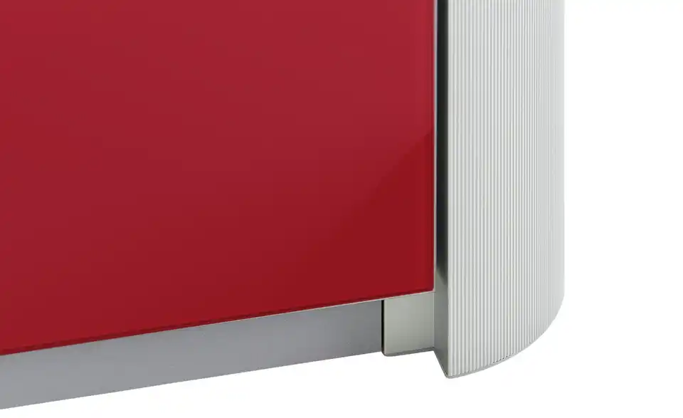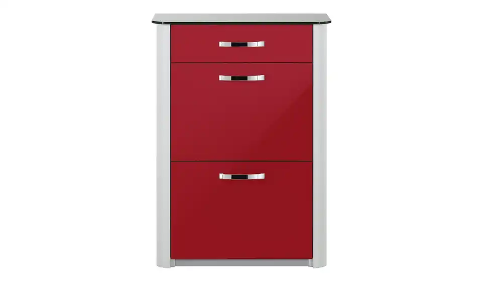 Für Ihre Schuhe empfehlen wir den Schuhschrank Juno. Er ist mit einer Schublade und zwei Klappen ausgestattet, wobei sich der Stauraum innen in vier Fächer unterteilt. Mindestens acht Paar Schuhe finden darin Platz. Die Einlegeböden können Sie in der Höhe variieren, was praktisch ist, wenn Sie höhere Schuhe unterbringen möchten. Junos Front hat eine Oberfläche auch hochwertigem Farbglas. Das kräftig rote Glas setzt sich vom alufarbigen Korpus und dem geriffelten Alurahmen ab.