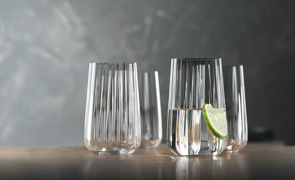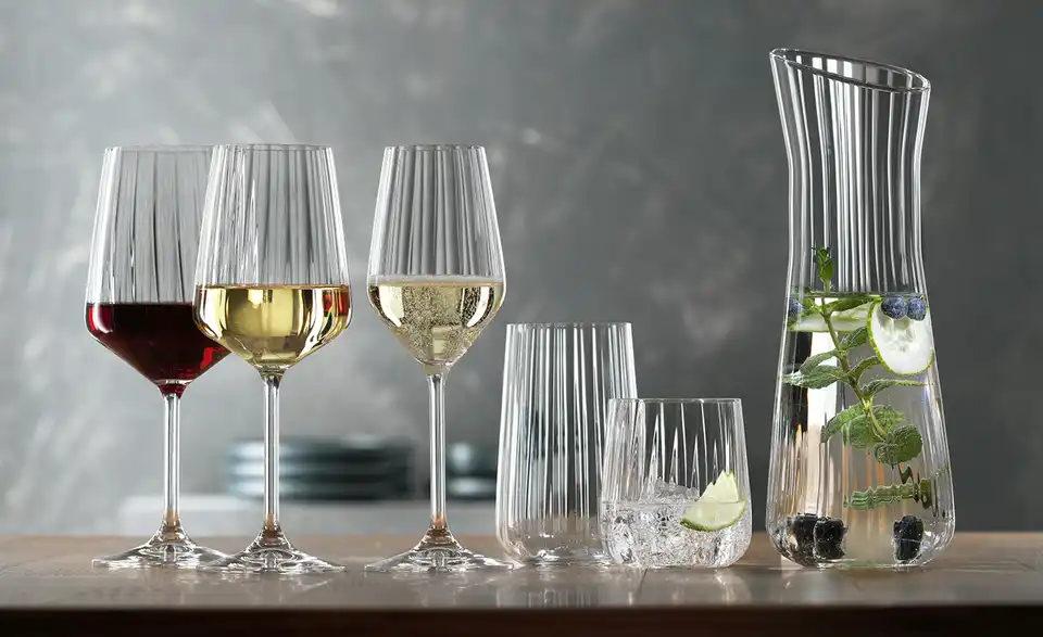 Die Serie SPIEGELAU Lifestyle besticht durch ihre elegante Linienführung. Überall dort, wo sich Lebensart und Zeitgeist treffen, haben diese Gläser ihren festen Platz. Die moderne Diamantform der Gläser wird durch die sanften Wellen der gleichmäßigen Reliefstruktur stilvoll verfeinert. Mit Brillanz und spannenden Lichteffekten garantieren die Kristallgläser ein stimmungsvolles Ambiente auf jedem gedeckten Tisch. Die Eleganz der Linienführung verbindet alle Glasprodukte dieser Serie zu einer charakterstarken Familie.