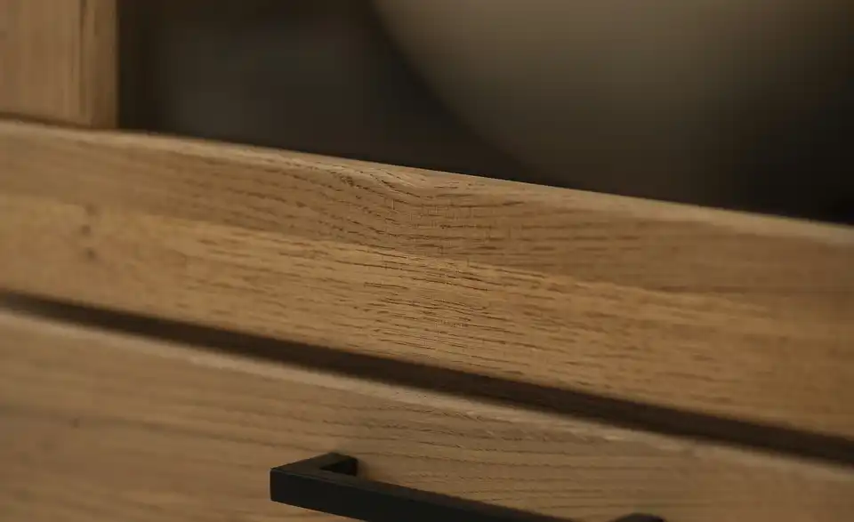 - Mehr zu Material Front aus Massivholz in Wildeiche geölt mit durchgehender Lamelle Korpus aus Holzwerkstoff foliert in Wildeiche (Nachbildung) Griff aus Metall in Schwarz pulverbeschichtet