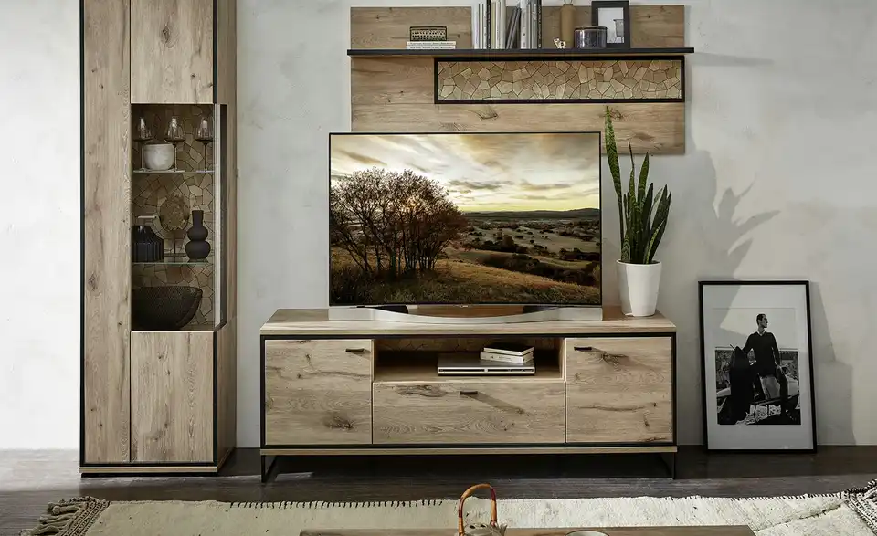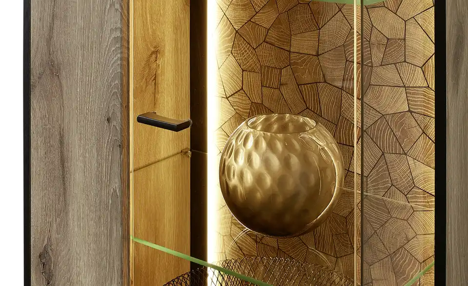 - Mehr zu Material Korpus und Front aus Holzwerkstoff foliert in Viking Oak Nature (Eiche Nachbildung) / Absetzung in Schwarz matt sichtbare Rückwand aus Holzwerkstoff foliert in Hirnholz Moasik Optik (Nachbildung) Front- und Seitenverglasung in Parsol Grau