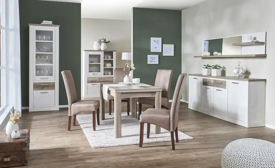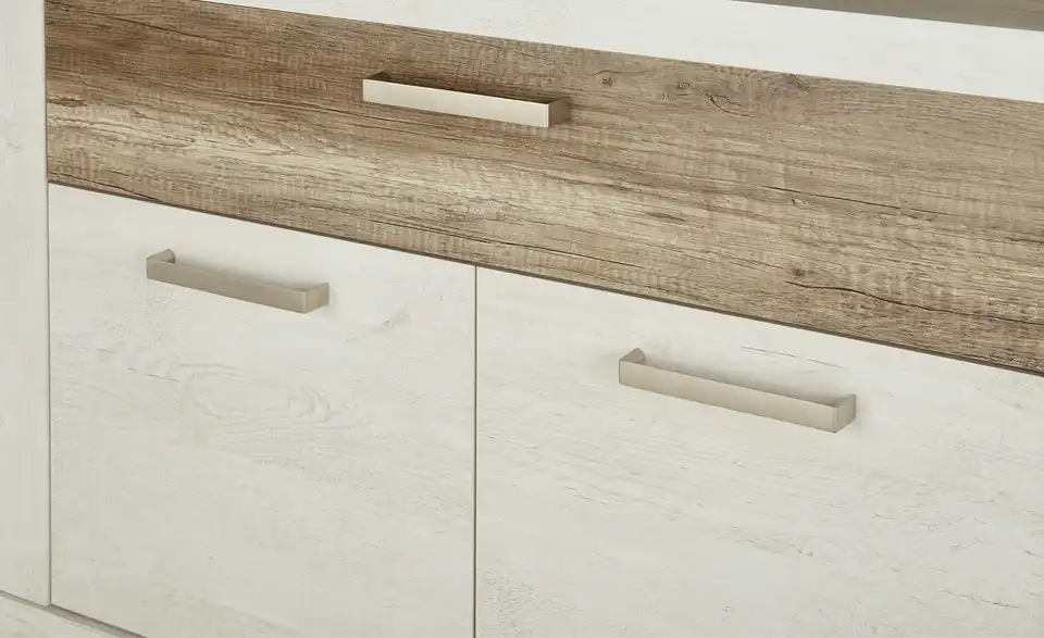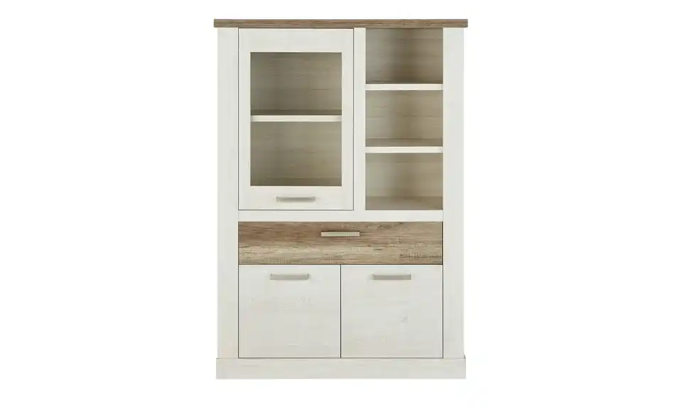 Viareggio ist eine attraktive Vitrine für Wohnraum und Esszimmer. Sie ist in weißer Pinie (Nachbildung) designt und wird in Eiche Antik (Nachbildung) abgesetzt. In den beiden Vitrinenfächern hinter Glas und in den drei Regalfächern können Sie besonders dekorative Dinge präsentieren. Weiterer Stauraum ist natürlich auch vorhanden. Er befindet sich in der mittigen Schublade und hinter den beiden Türen. Die Oberflächen sind foliert und deshalb strapazierfähig und leicht zu pflegen.