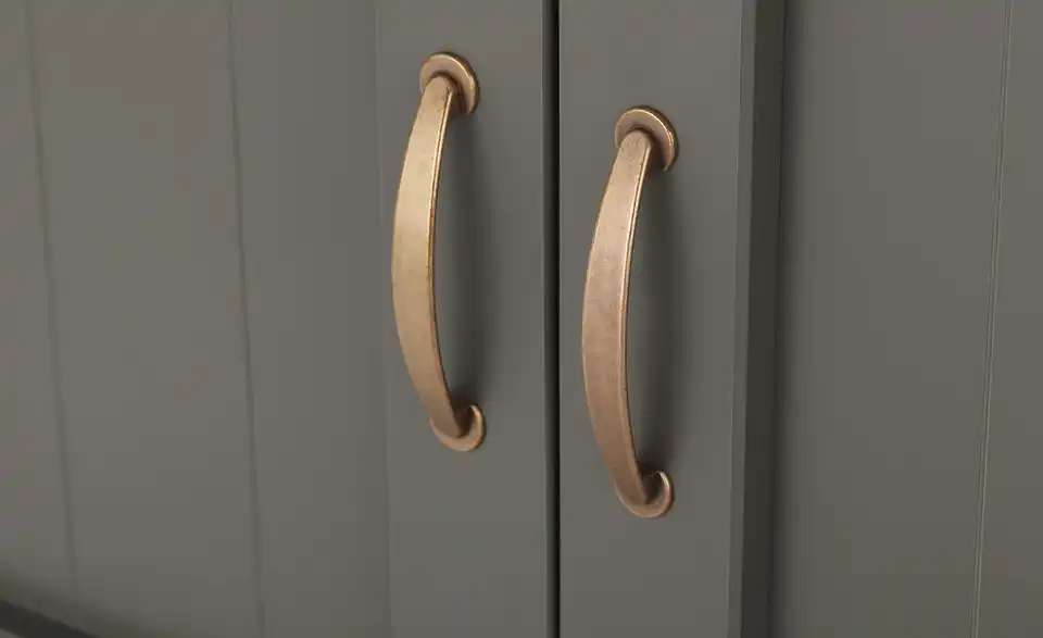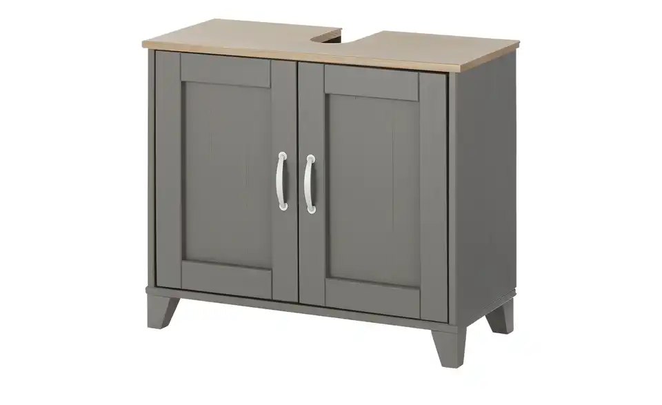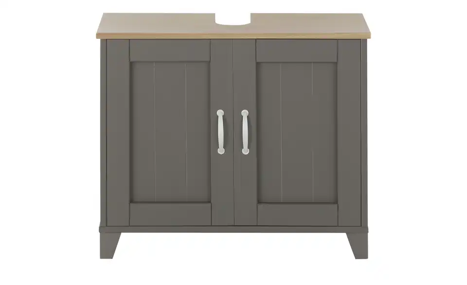 Mit dieser Möbelserie holen Sie sich den beliebten Landhausstil jetzt auch ins Bad. Der Waschbeckenunterschrank spielt mit Kontrasten: Grau lackiertes Kiefernmassivholz hebt sich von der Ablageplatte in Eichennachbildung ab. Sie haben außerdem die Wahl zwischen kupferfarbenen und silberfarbenen Griffen. Hinter den beiden Türen befinden sich zwei Fächer für Handtücher, Pflegeprodukte und Mehr.